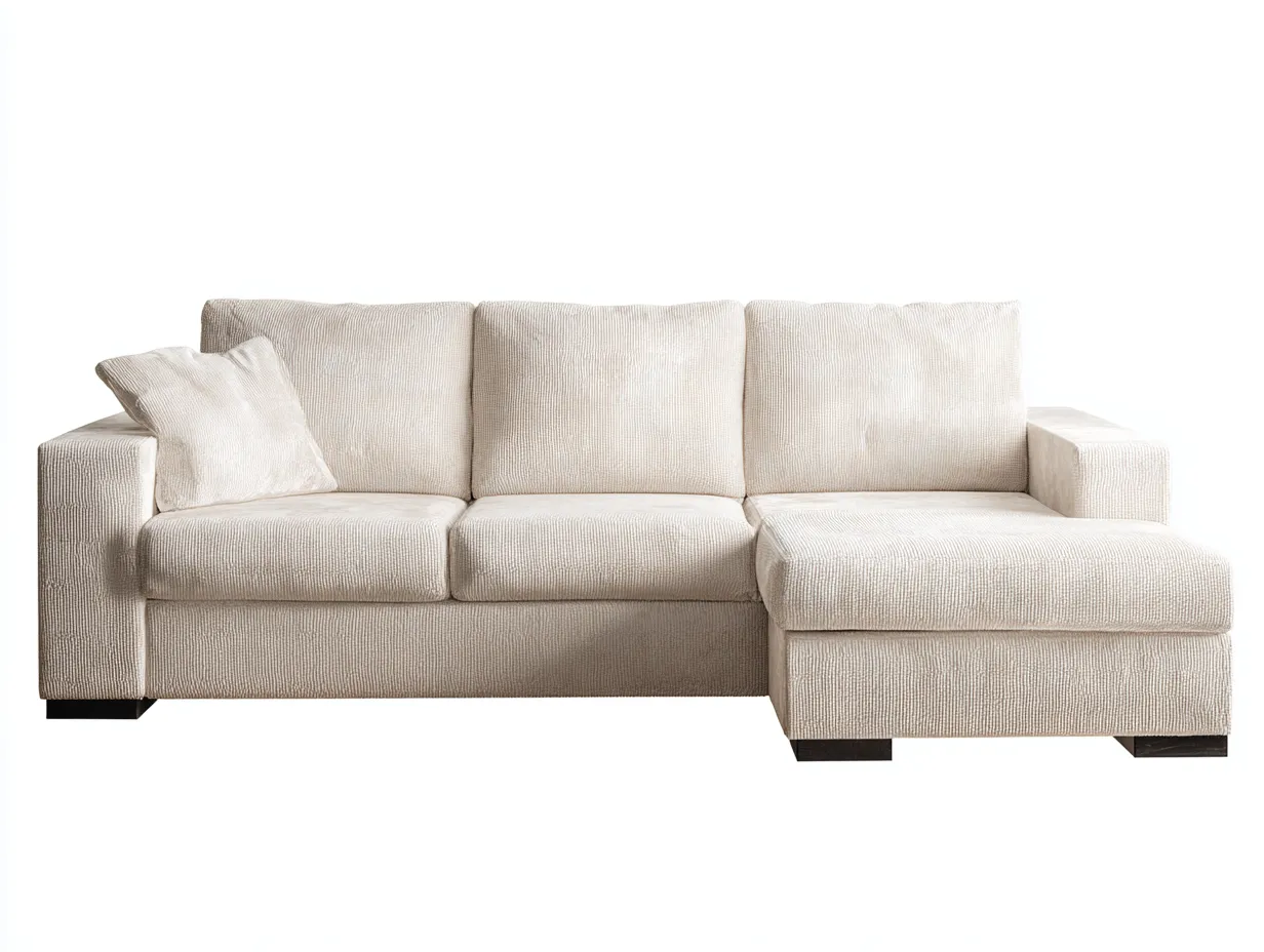 Dieses Ecksofa ist für moderne Wohnräume ausgelegt und verbindet eine großzügige Sitzfläche mit klaren Proportionen. Die ausgewogene Formensprache und die helle Farbgestaltung sorgen für eine ruhige und einladende Wirkung im Wohnbereich.