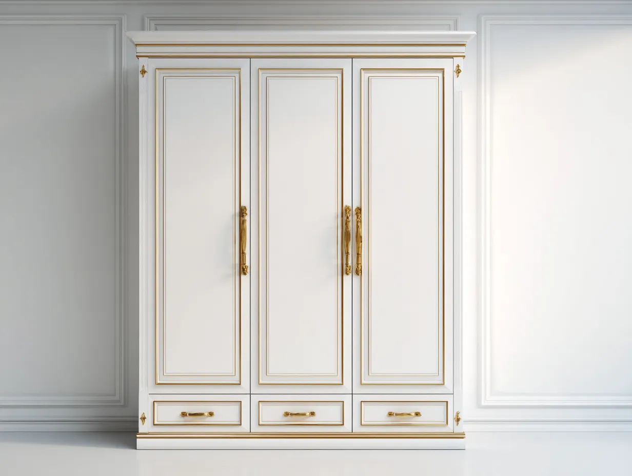 Diese Kleiderschränke mit drei Türen sind für klassisch eingerichtete Schlafräume konzipiert und zeichnen sich durch eine ausgewogene Proportion sowie eine klare Linienführung aus. Die weiße Oberfläche in Kombination mit goldfarbenen Details verleiht dem Möbelstück eine ruhige und elegante Ausstrahlung.